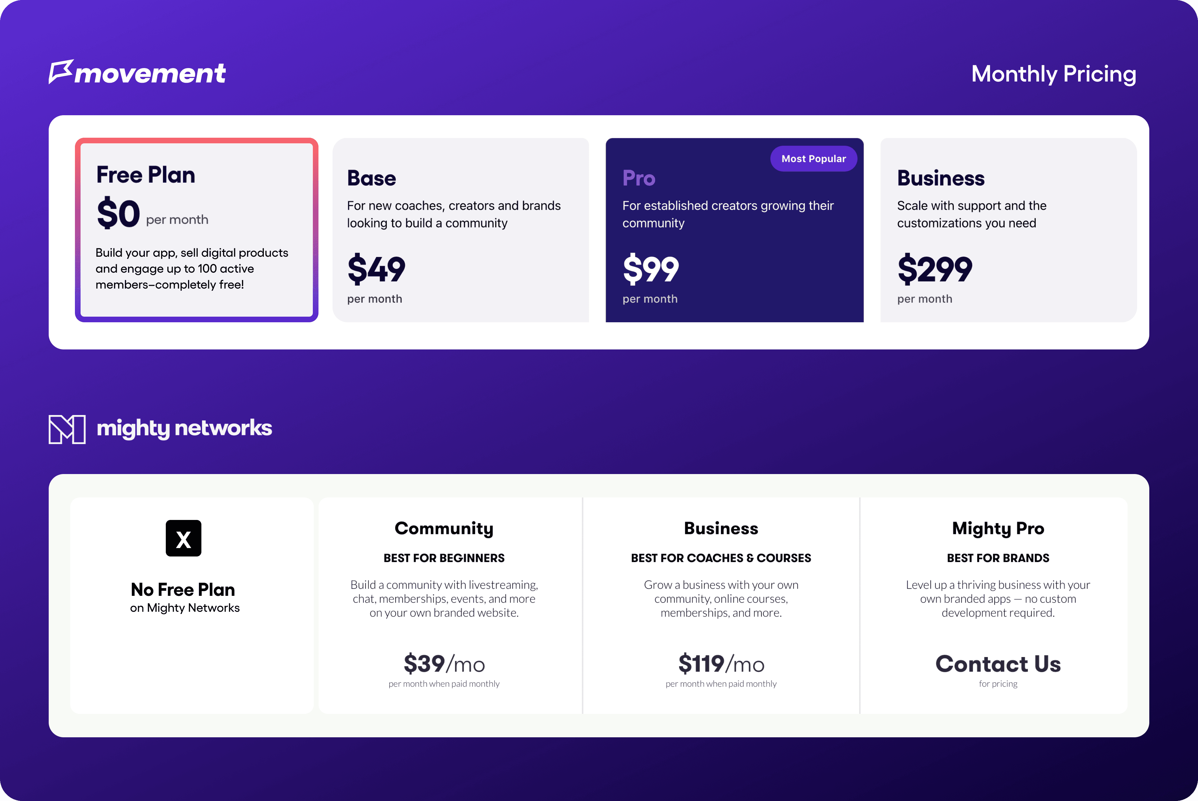 While both Movement and Mighty Networks offer pricing plans to suit various needs, Movement stands out with its flexibility and budget-friendly options. The free trial and free plan allow you to experience the platform without any financial commitment upfront. The Base plan offers valuable features at a competitive price, while the Pro plan provides branding control, white-labeling and full customization options at a fraction of the cost of Mighty Networks Pro ($2000/month).