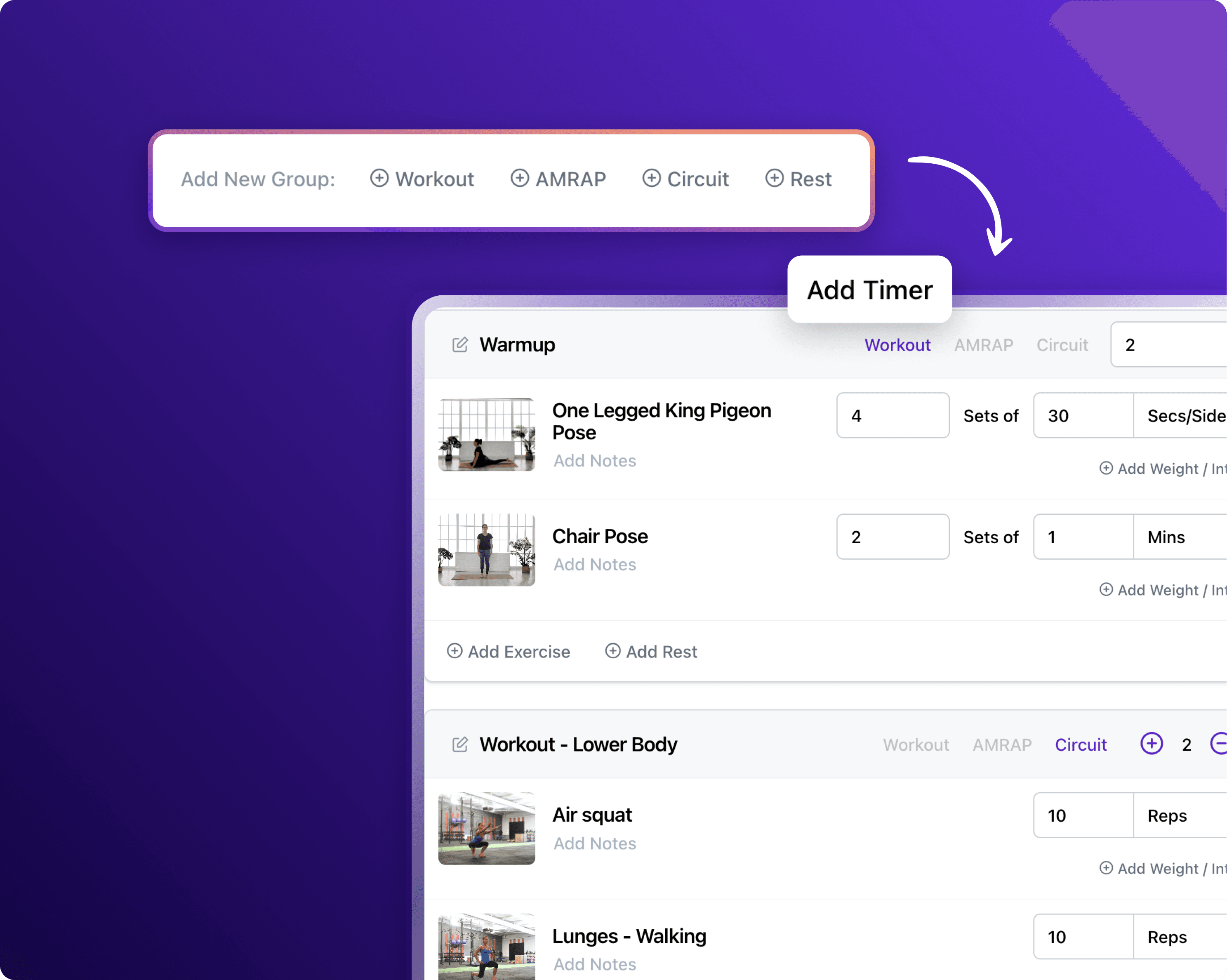 Combine different groups of exercises like warm-ups, strength training, circuits, supersets and cooldowns into one cohesive workout. Adjust intensity, sets, reps, and other parameters to suit various fitness levels, keeping your workouts diverse and dynamic.